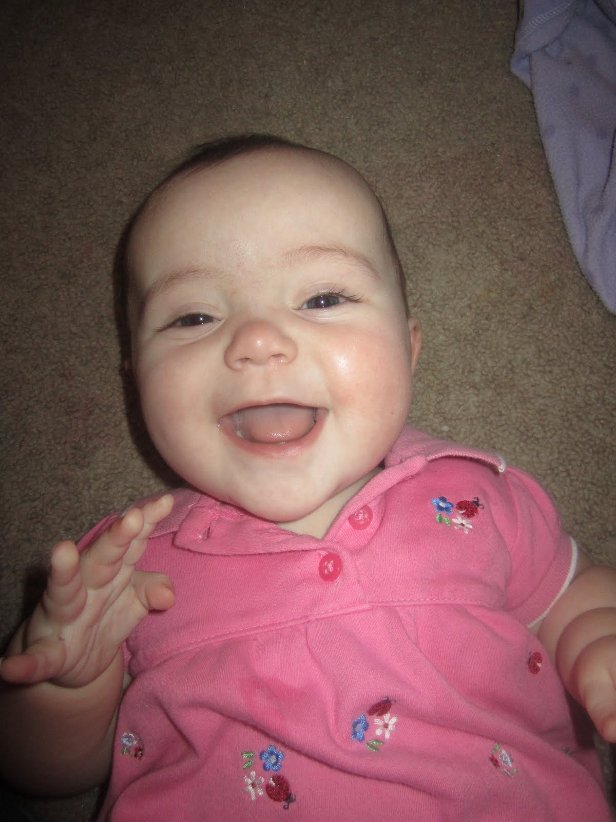 The Inara monthly report is in. She is eight months old today! The thought of my baby being one year old in four months doesn't seem possible. Today she crawled off belly about a foot. She is also getting better at using my hands to pull to stand. I know it won't be long before I find her standing in her crib.